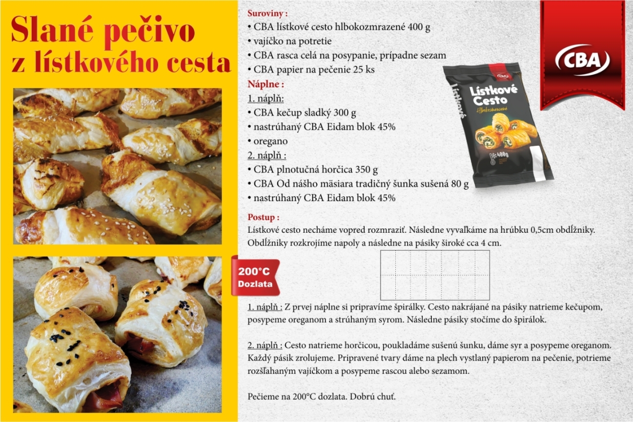 Slané dobroty z lístkového cesta sa dajú pripraviť aj z toho, čo práve máte doma. Môžete pridať CBA kukuricu SWEET Corn, prípadne CBA dusenú šunku. Fantázii sa medze nekladú. Dobrú chuť