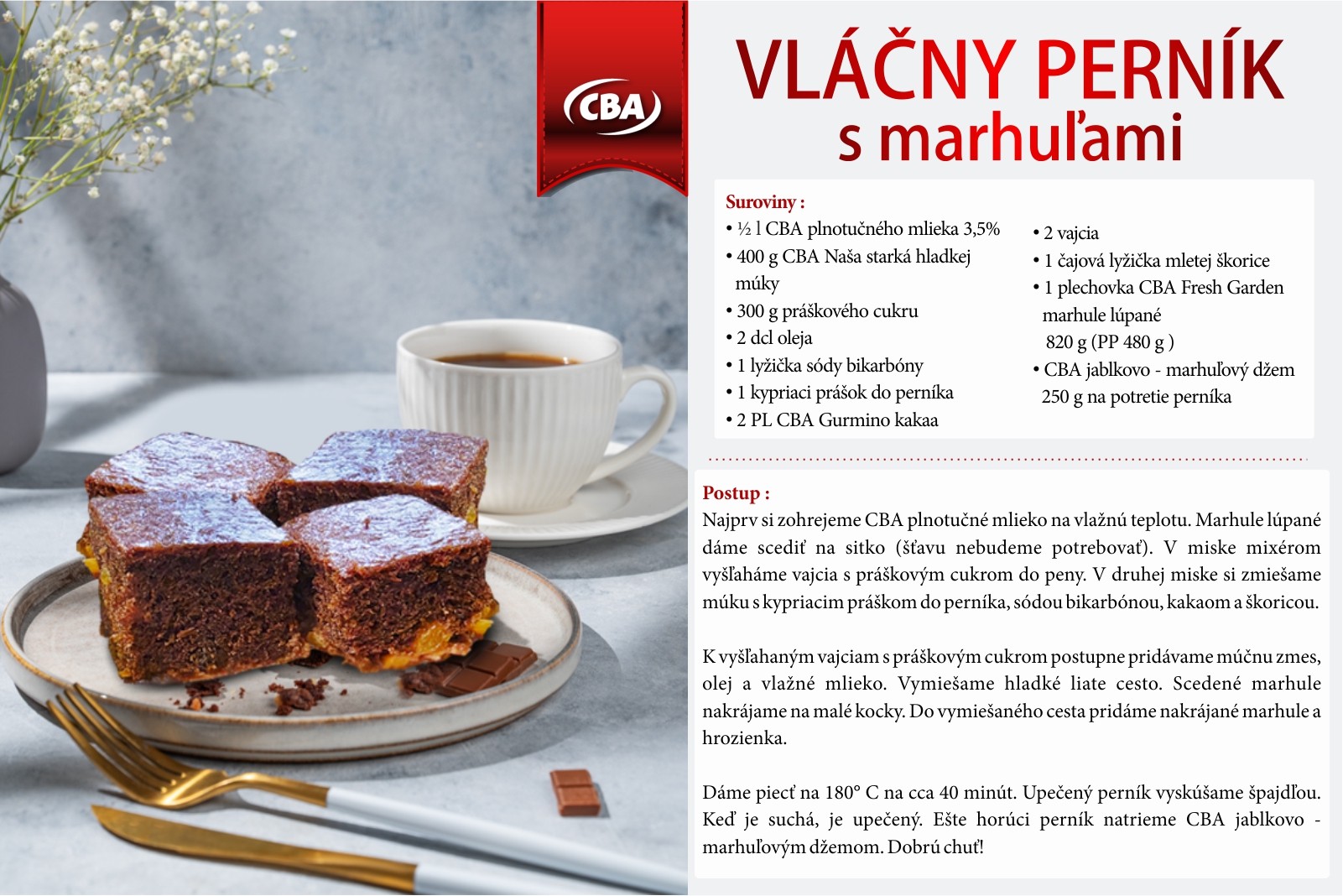 Najprv si zohrejeme CBA plnotučné mlieko na vlažnú teplotu. Marhule lúpané dáme scediť na sitko (šťavu nebudeme potrebovať). V miske mixérom vyšľaháme vajcia s práškovým cukrom do peny. V druhej miske si zmiešame múku s kypriacim práškom do perníka, sódou bikarbónou, kakaom, škoricou.
